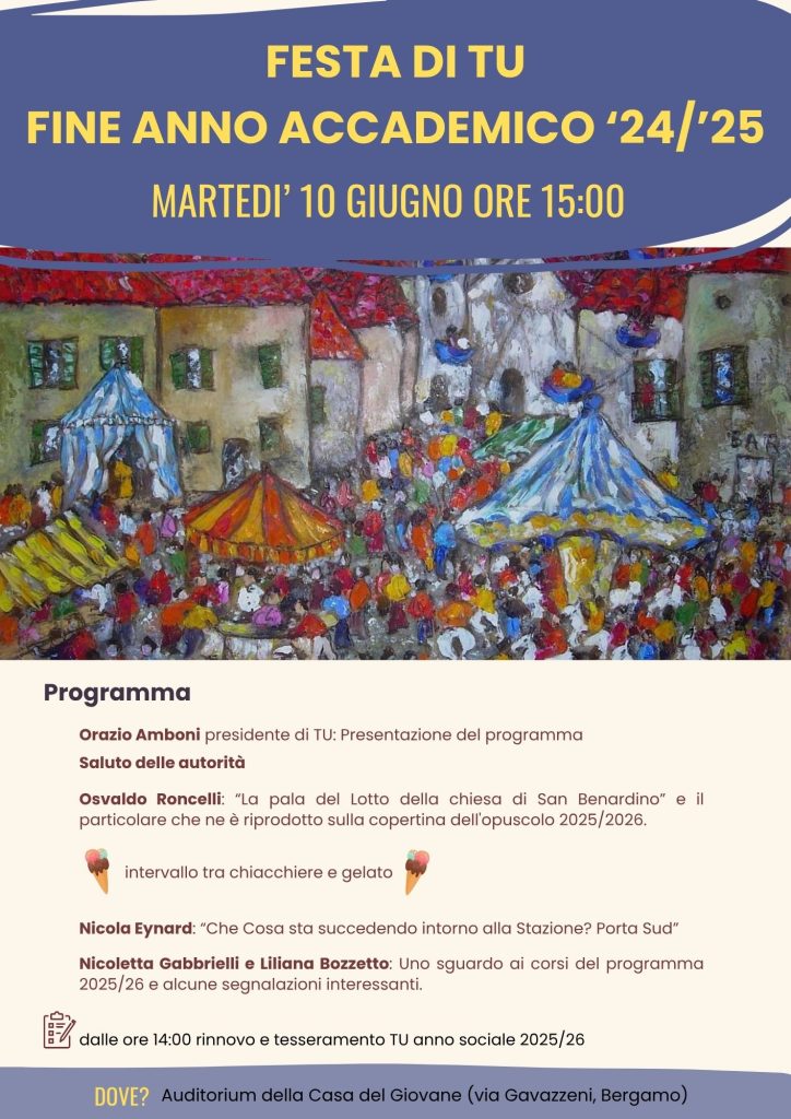 MARTEDI’ 10 giugno dalle ore 15:00, festeggiamo insieme la fine dell’anno accademico 2024/2025! Vi aspettiamo per il consueto pomeriggio di saluti, per scoprire in anteprima il nuovo programma 2025/2026 e non mancherà il gelato!