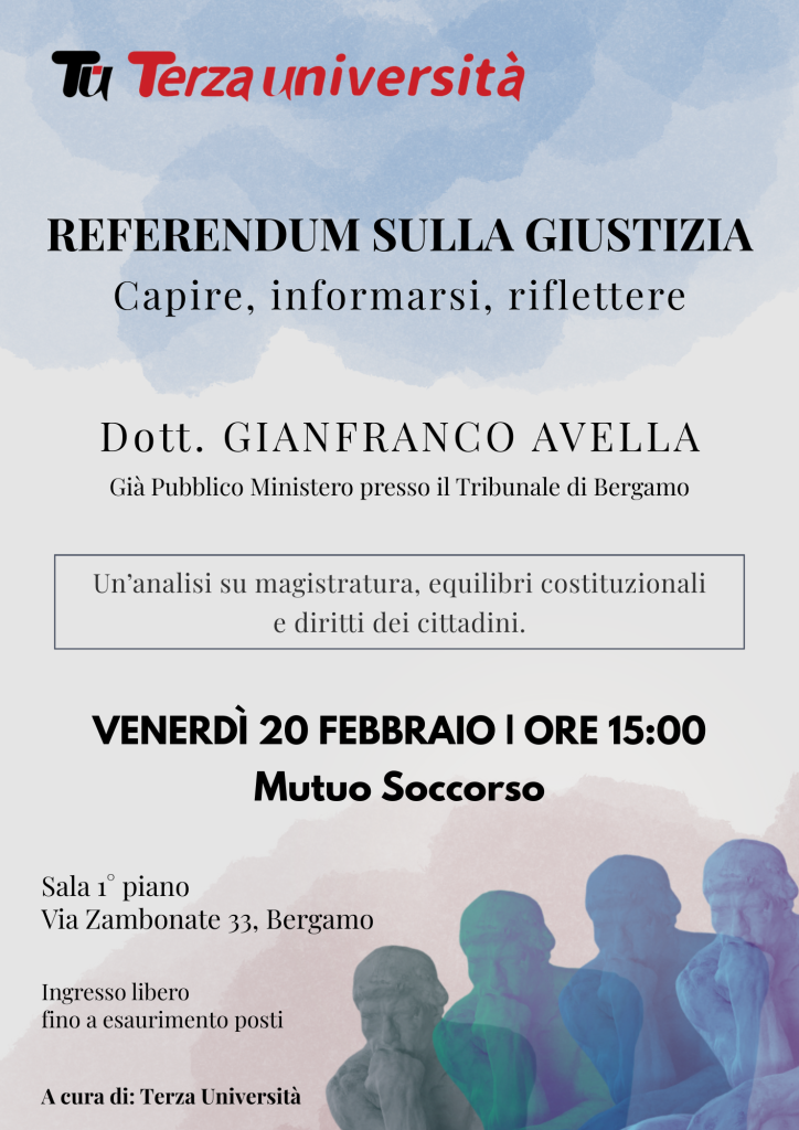 Terza Università, in vista dell’imminente Referendum sulla Giustizia, organizza un incontro per capire ed essere informati sul tema. Ce ne parlerà un esperto, il dott. Gianfranco Avella che conosce molto bene la materia perché è stato per anni Pubblico Ministero proprio qui a Bergamo, occupandosi anche di molti casi di primo piano.
