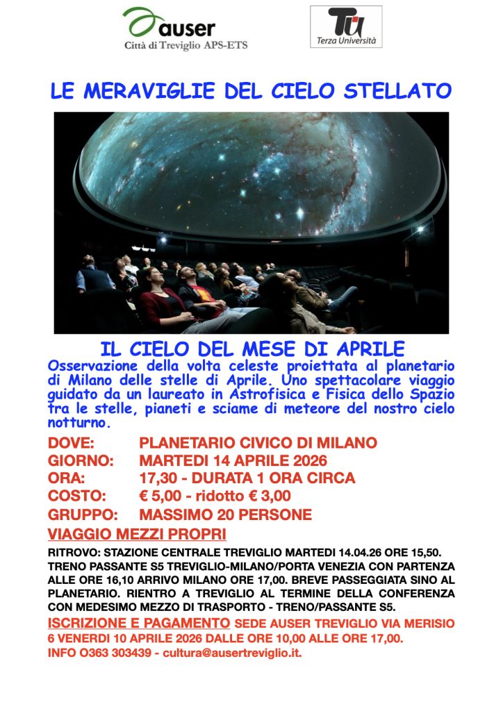 Visita al planetario di Milano con osservazione guidata del cielo di Aprile ad opera di un esperto di Astrofisica Iscrizioni entro il 10 Aprile sede Auser.